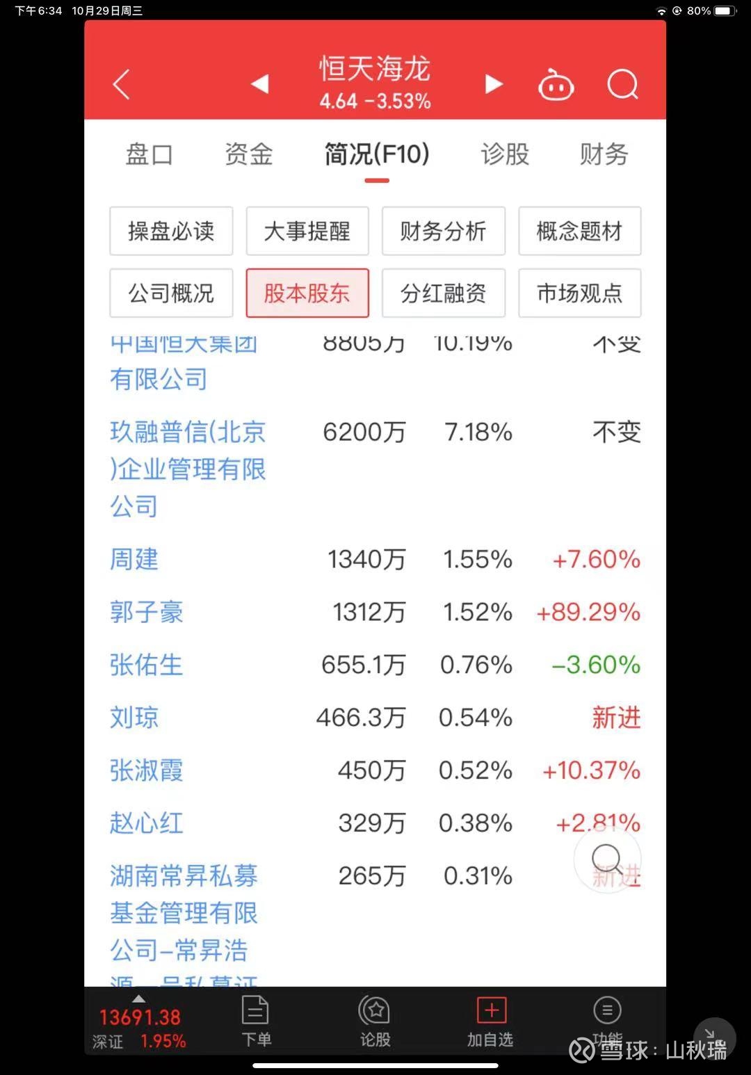 从三季报股东的结构看,新进了牛散刘琼,还有牛散(郭子豪)大幅度的加仓恒天海龙。此外,也有牛散和外资出逃。