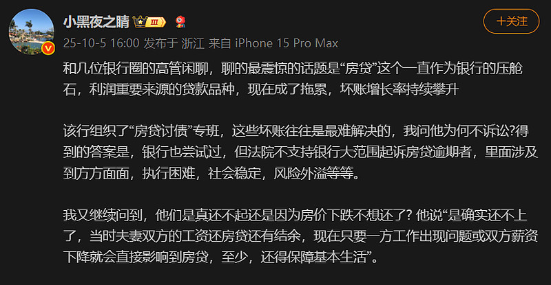 从银行的财报看,没那么夸张,坏账率也好,利润也好,至少现在都没太大变化(或者说都还能盖得住),股价上也丝毫看不出有什么大影响。不过,如果房子/经济继续低迷下去,利率继续下行,那么最终必然会影响银行利润,导致分红也下滑(高股息的配置逻辑也最终会不存在)。