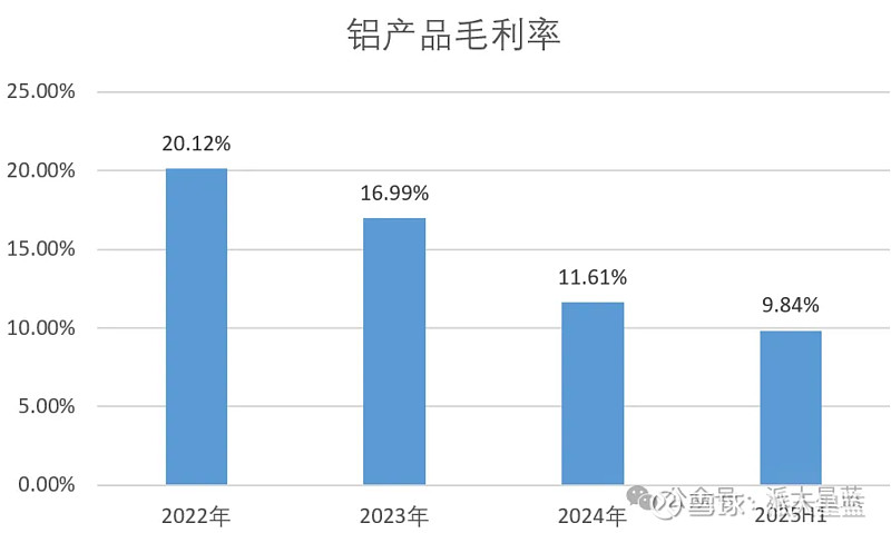可以看到22年之前营业收入增长较快,利润也增长比较快,但是22年后营业收入相对稳定,但是利润大幅下降。从前节分业务表格也可以看到,近年铝产品毛利率下降也很多。