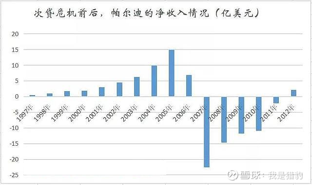 次贷危机前,2005年巅峰期,帕尔迪总收入147亿美元,净利润14.9亿美元,2007-2011年连续五年亏损,2008年亏损14.7亿美元;2007年亏损22亿美元。当危机在2012年左右见底,市场开始复苏时,许多竞争对手已经倒闭或元气大伤。帕尔迪能够迅速收购廉价土地,抢占先机,市场份额大幅提升。