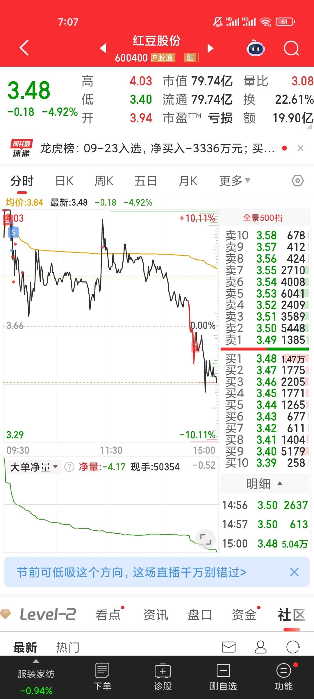 4.红豆股份有些可惜,周一就买进去了,周二半上加仓。收盘反了亏了不少。大哥首开负主要责任。昨晚想了一会儿,这两天主力成本都不低,没露面被套的大资金也应该不少,加上盘中主要是最后半小时大幅度杀跌,今天或许还会给个高开?早起一看美股这比样,再说吧,竞价和开盘5分钟定生死了。$红豆股份(SH600400)$查看图片