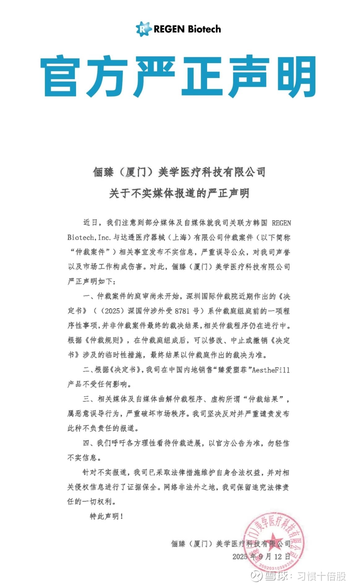 这是什么意思?意思就是,江苏吴中提出申请希望仲裁庭能够让爱美客停止销售自己家的AestheFill产品,也不要授权给其他人销售,但是这个申请被驳回了,也就是仲裁庭并未支持,反过来,就是默许了爱美客当前的行为,韩国公司重新授权了俪臻厦门为新的代理商,让爱美客可以继续卖自己的臻爱塑菲AestheFill。