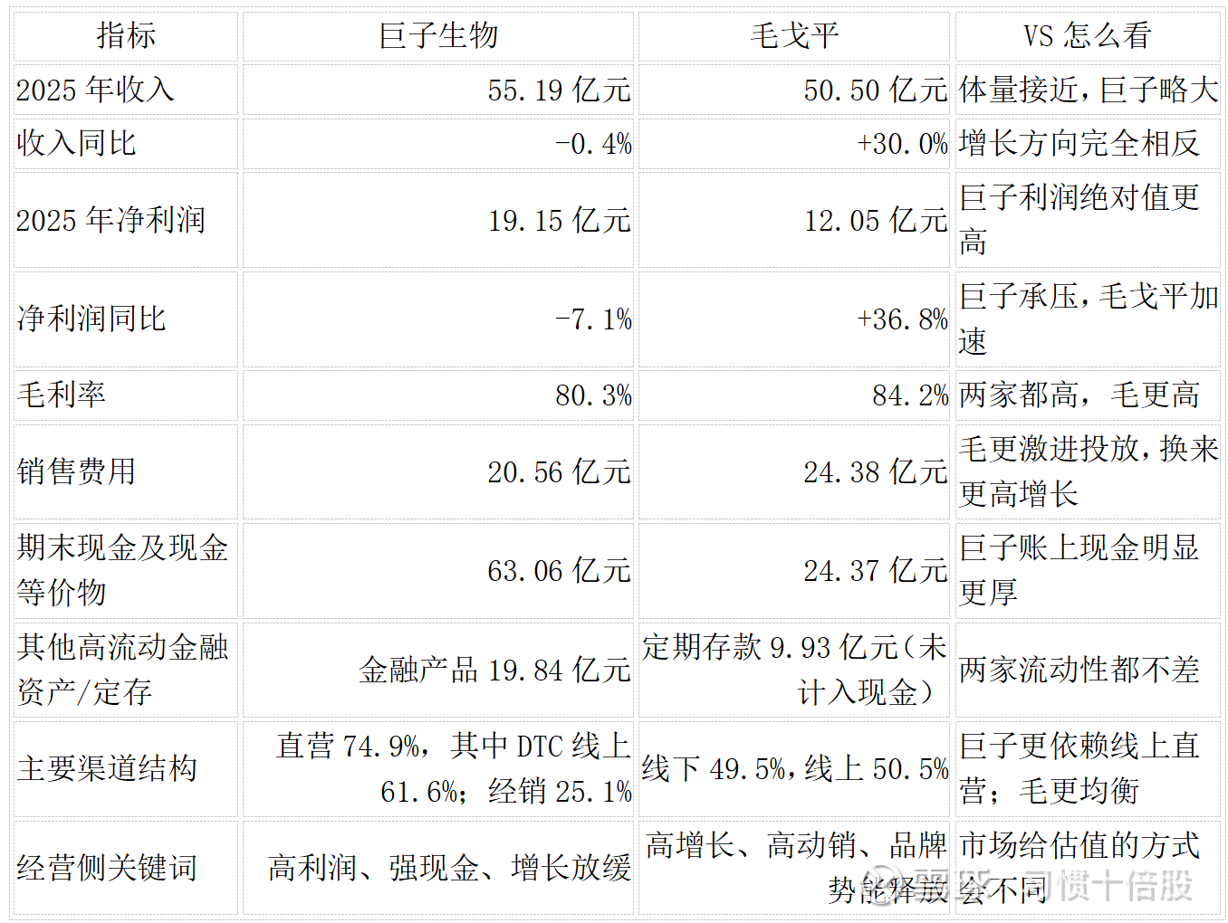 两家公司都不差,但它们已经走进了两条完全不同的投资逻辑:巨子生物更像“高利润率、强现金储备、但增长放缓”的功效护肤平台,主打科技信任;毛戈平更像“高端品牌势能兑现、收入利润同步高增”的消费成长股,主打审美信仰。先来看看他们的一些指标。