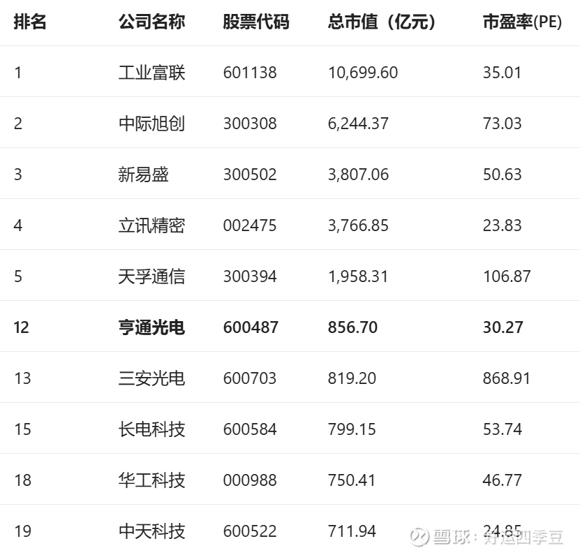 亨通光电在CPO板块中市值排名第12位,但PE估值仅30.27倍,明显低于中际旭创(73倍)、新易盛(51倍)、天孚通信(107倍)等纯光模块企业。