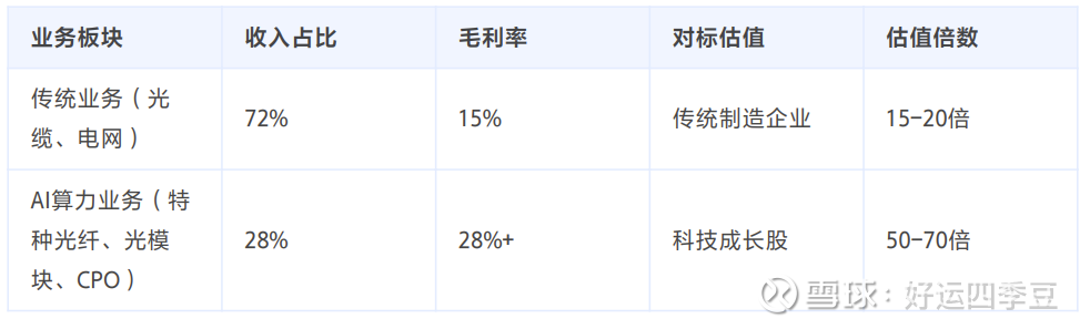 亨通的估值逻辑:传统业务(光缆、电网)拉低整体估值,但AI算力业务的估值弹性巨大对比长飞光纤(1339亿市值,234倍PE),亨通的全产业链布局和空芯光纤技术支撑了更高的成长预期