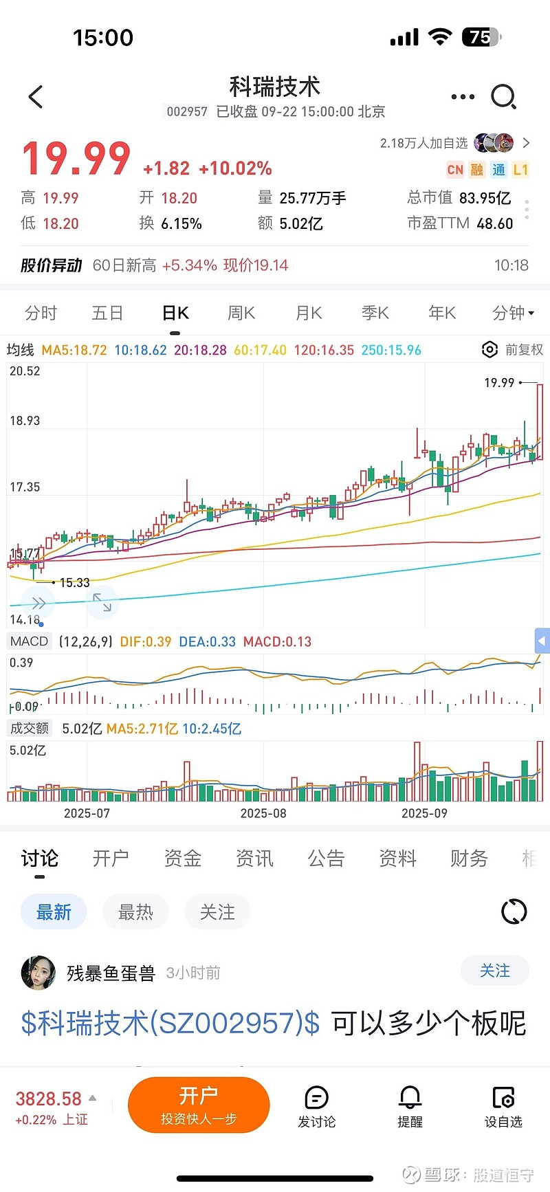 $金冠股份(SZ300510)$ $科瑞技术(SZ002957)$ 今天科瑞放量涨停板,最近买的票只要涨停,大脑就会发出强烈卖出信号,再三思量坚决斩仓,还是要做到知行合一。再次回到金冠股份建仓,搏一个超跌的机会,不知对错,答案交给时间去验证。