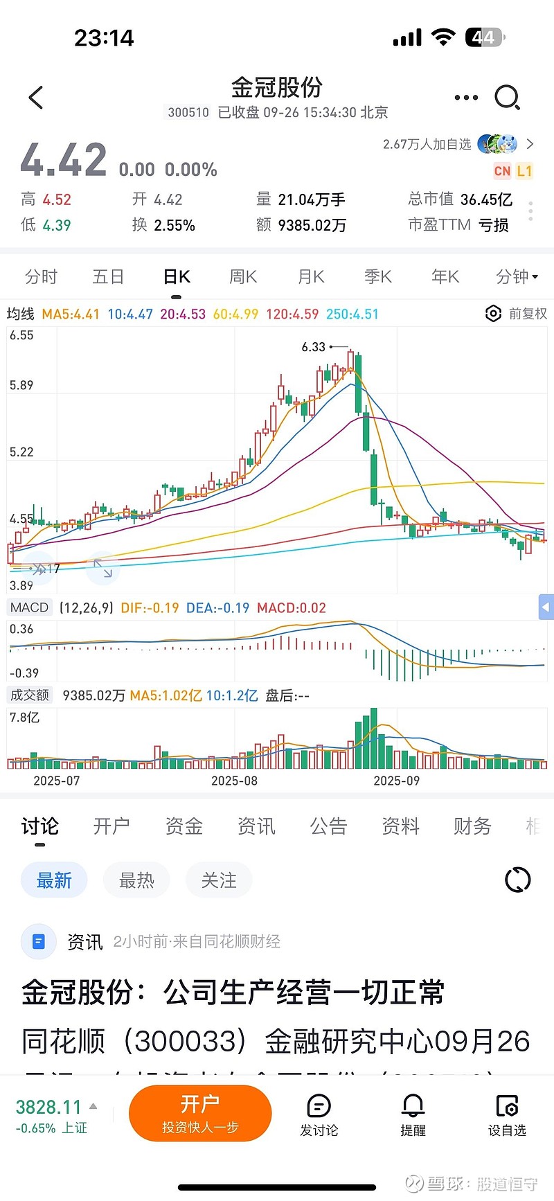 $金冠股份(SZ300510)$⼃金冠股份卖出后空仓第3天。因为要集中精力研究稳健长赢迭代新模式,力争每年3倍新目标,自2025年9月29日开始,不再每个交易日发布专栏帖子,更改为每完成一笔买卖交易,卖出后以一个小帐户实盘的形式发布,到时大家可以看到股票名称、金额、仓位、盈亏,及成本价、卖出价等关键信息,如有咨询跟随请私信交流。在此感谢大家的支持与信任,祝愿粉宝们股市一路长虹。