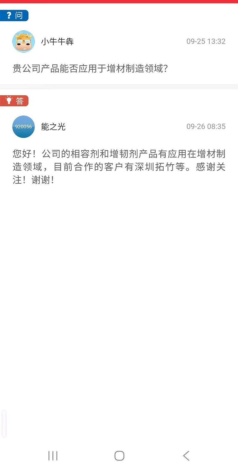 公司的相容剂和增韧剂产品有应用在增材制造领域,目前合作的客户有深圳拓竹