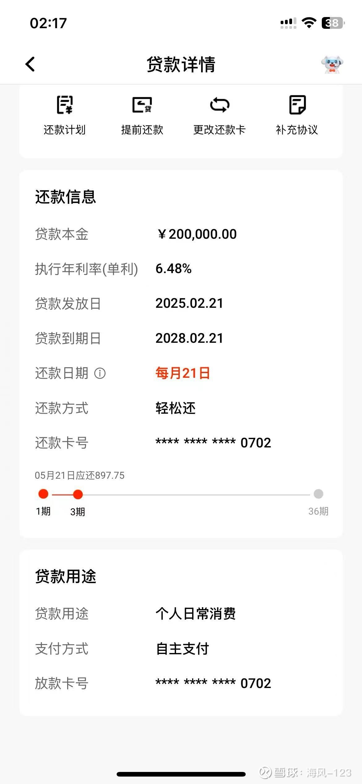 $平安银行(SZ000001)$ $腾讯控股(00700)$ $贵州茅台(SH600519)$ 分享一个差点掉坑的事情,去年贷款了平安银行2.88的利率,随借随还,没有任何利率变动,提前还款也没有违约金之类的,感觉不错。今年又出了一个2.7的利率,觉得很划算,也就贷款了20万,3月底有一点闲钱,觉得先还上一部分,发现有优惠退还要求400多元,问了一下平安的客户经理,告知还款2个期就不会有优惠退还了。昨天终于还了2期,也就提前还款了3万多,今天突然发现2.7的利率升到了6.48了,今天一直问平安银行客户经理怎么回事,一直也没有得到正面回复,想想算了,赶紧找了招行的闪电贷顶上。