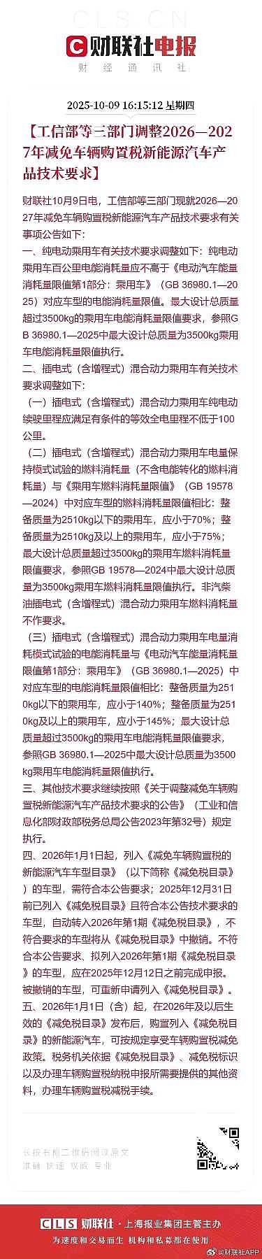 工信部等三部门调整2026-2027年减免车辆购置税新能源汽车产品技术要求:具体车型要看《减免车辆购置税的新能源汽车车型目录》