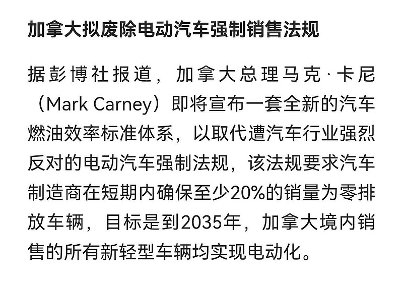 $比亚迪(SZ002594)$ 环美电车市场正在起变化据彭博社报道,加拿大总理马克·卡尼即将宣布一套全新的汽车燃油效率标准体系,以取代遭汽车行业强烈反对的电动汽车强制法规,该法规要求汽车制造商在短期内确保至少20%的销量为零排放车辆,目标是到2035年,加拿大境内销售的所有新轻型车辆均实现电动化。