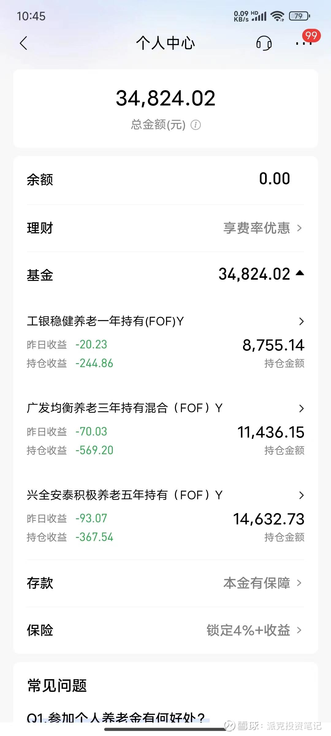 2024.05.11 投了3年的养老金,目前亏损3.26%,回顾下如果年初晚买入1个月,大概率目前能少亏3%,不过整体来说还可以接受,其实我还是没有特别考虑好2024是否还需要持续买入,对于养老金给予的收益账,我还是有点没算明白,到底是一次性30%买断,还是可以算成年化3%。