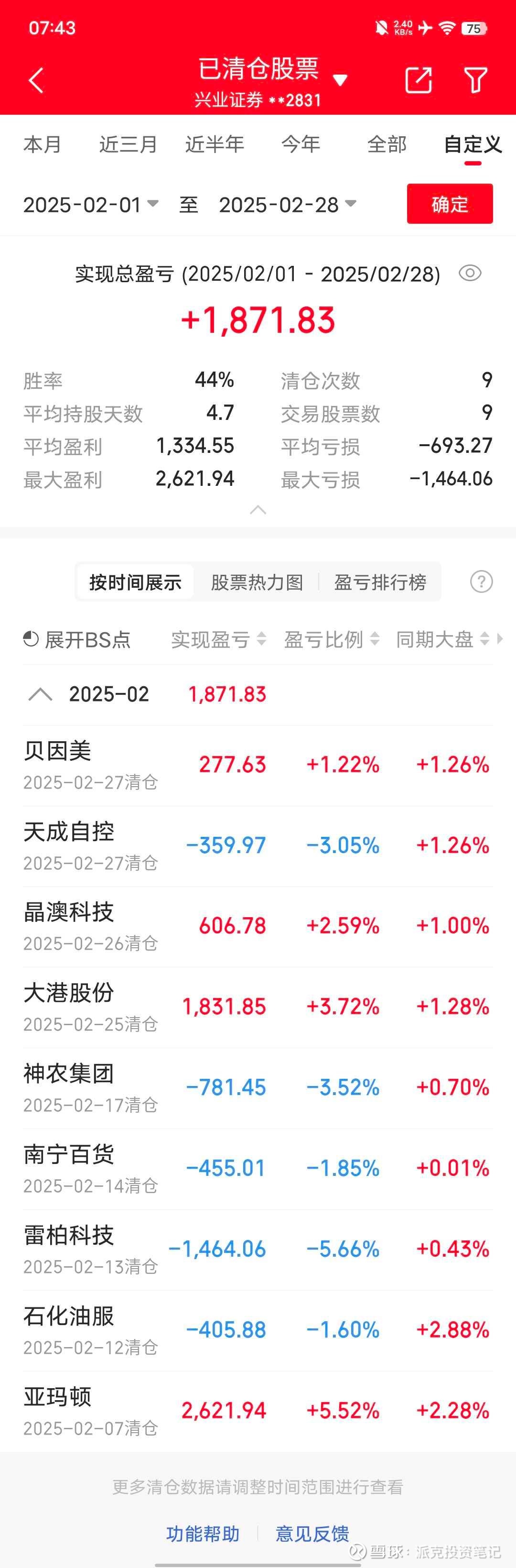 2025.2 一共盈利1871.83,胜率4/9,上证指数上涨2.16%,远远跑输指数。