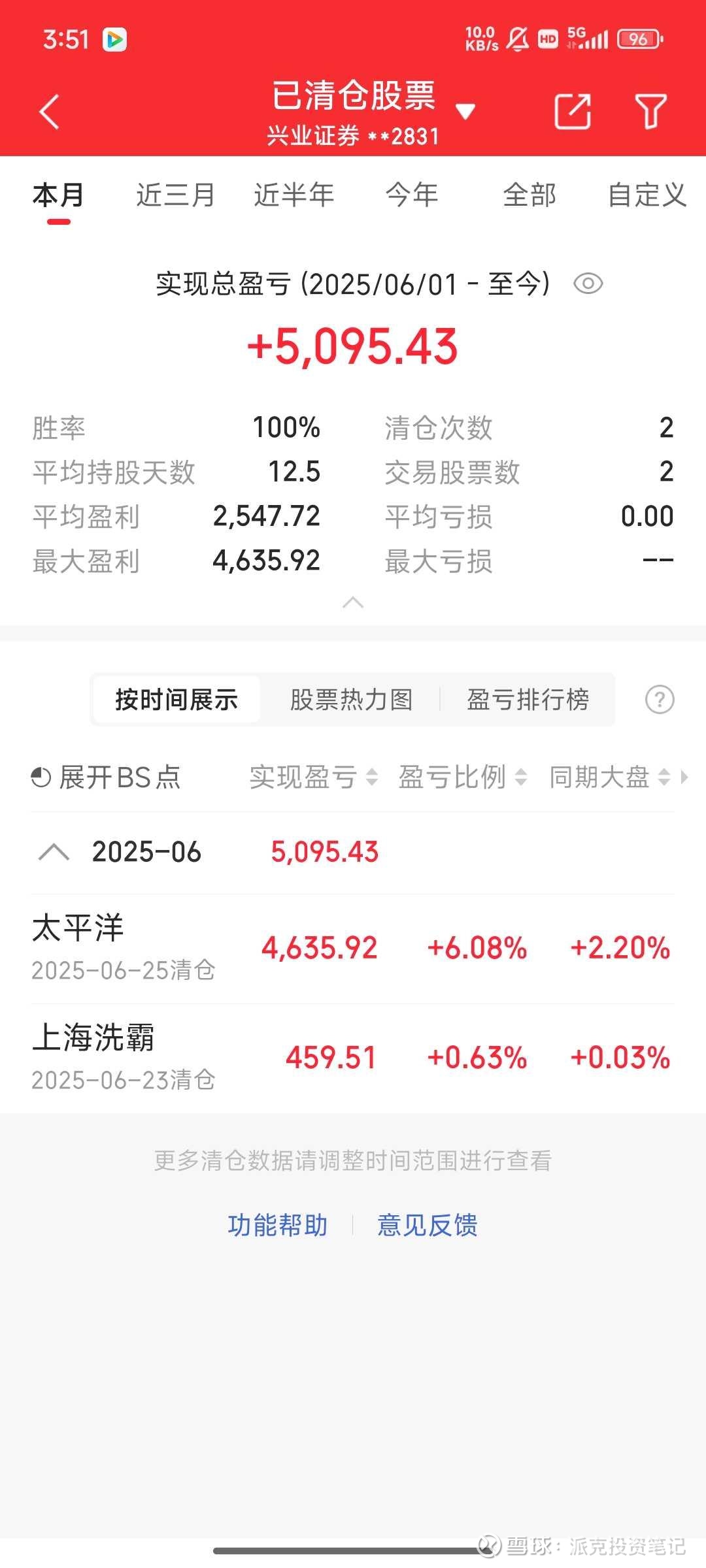 2025.6 一共盈利5095.43+,胜率2/2。 前五个月各种忘我的频繁无敌操作,不如六月一动不动,所以还能说啥呢,菜就认,韭就服,没啥可说的。 上海洗霸 再忍几天,亏损四年的账号就回本了,那怎么办,水平不行,认,向市场低头不丢人,再慢慢修炼就行了!别急,追涨杀跌,年底小账户亏完!