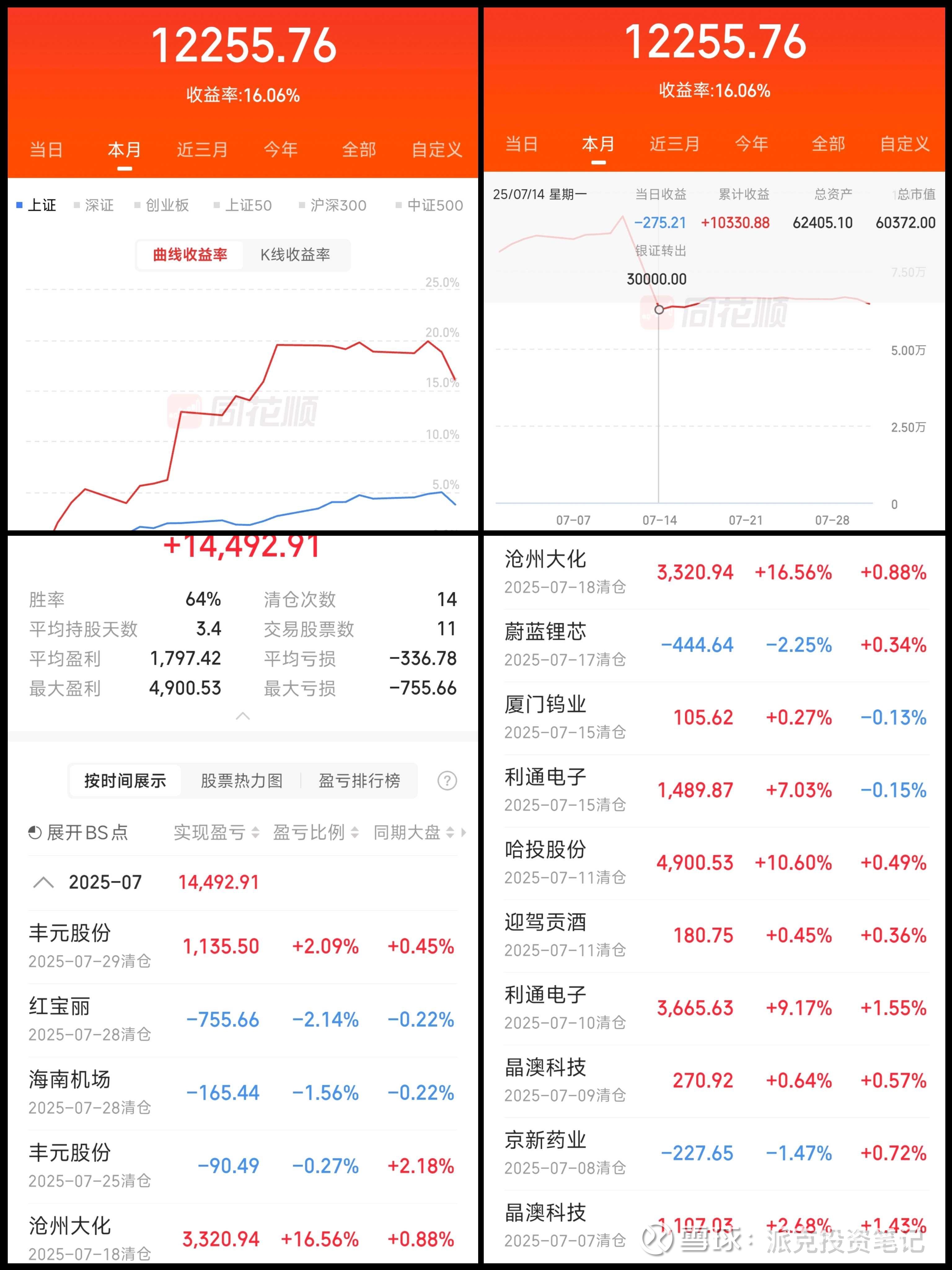 这个月如果不算今天还是完美的,小账户在亏损四年办之后,最多亏-75%,到7.18账户回本后,我就不敢太大仓位搞了,想先稳一稳,结果还是在最后两天没抗住,直接破防了,算了,韭中韭,菜中菜,如果不转出3万本金,怕是现在亏的更多,韭菜的命,认了!