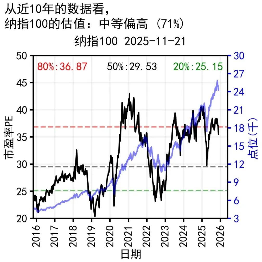 最近,纳指100迎来了新一轮的下跌,估值重新回落到了中等偏高(链接:第86期 全球指数估值与个人记录 2025.11.22)。