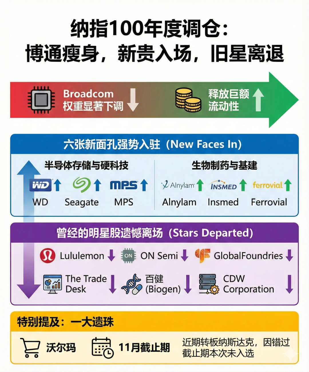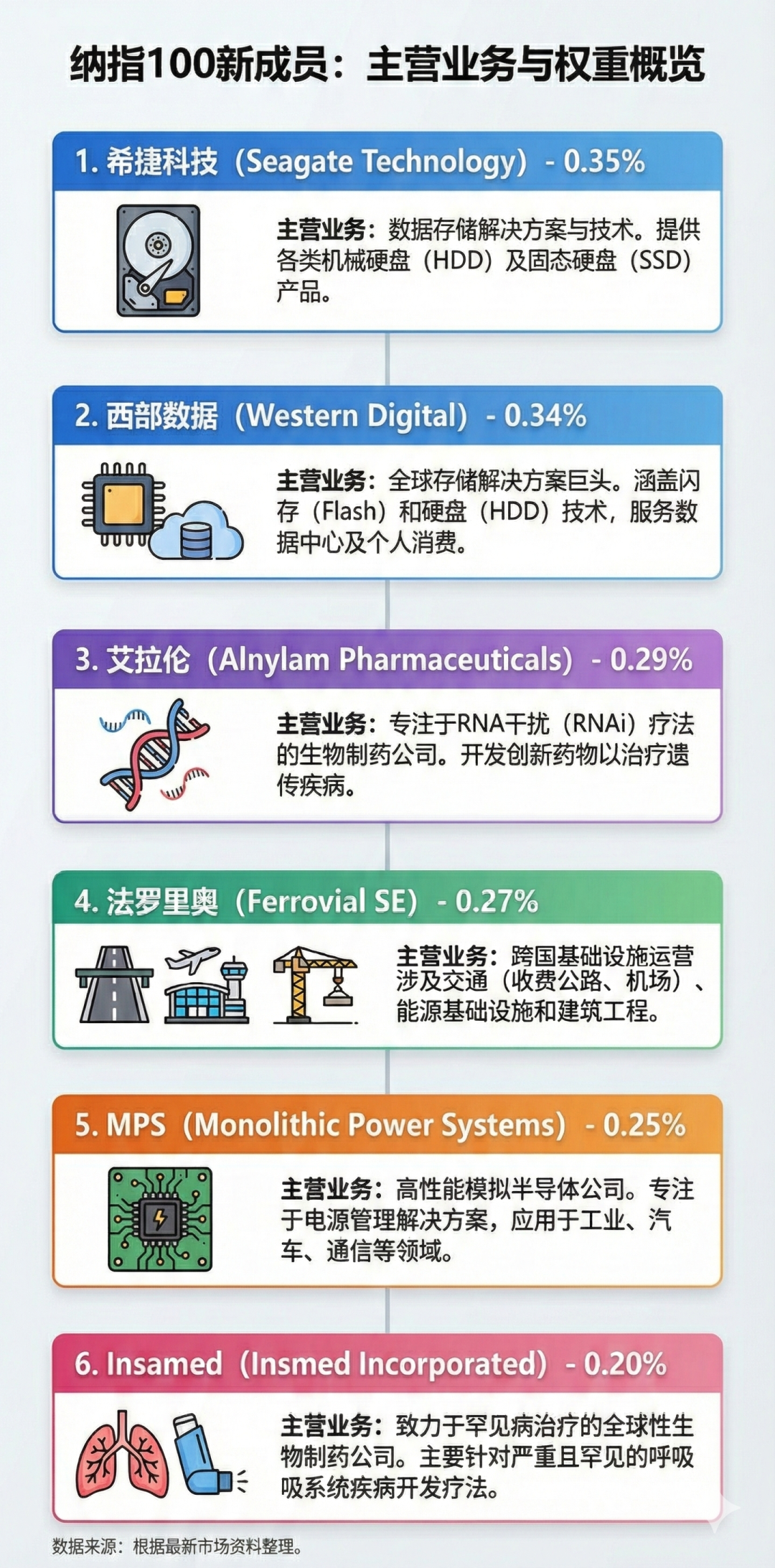 西部数据、希捷、MPS(电源管理芯片)代表的半导体存储与硬科技板块携手生物制药新贵 Alnylam、Insmed及基建巨头 Ferrovial 强势入驻。