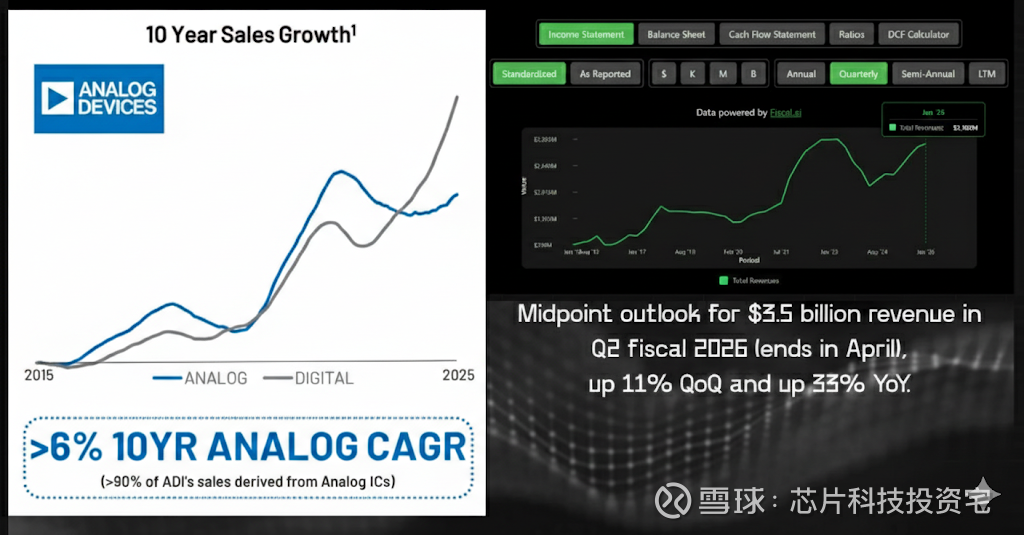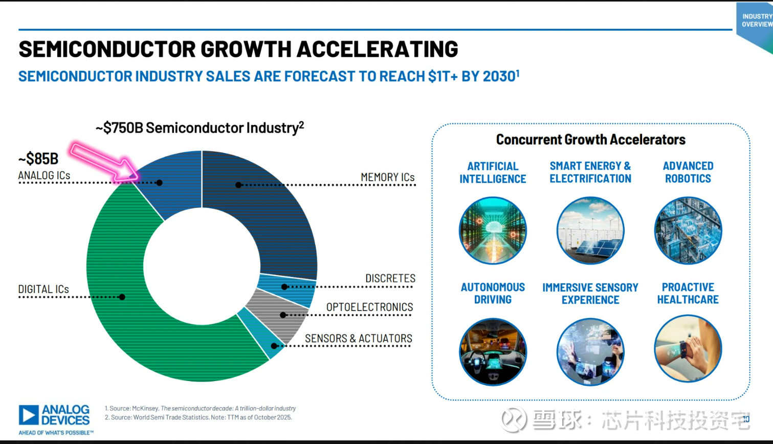 顾名思义,模拟芯片是 ADI 的强项。虽然模拟电路在整个行业终端市场的市场份额中占比较小(~850 亿美元,占 2025 年~7500 亿美元终端市场销售额中的 850 亿美元),但模拟集成电路(ICs)在 ADI 客户群中的需求正在增长。