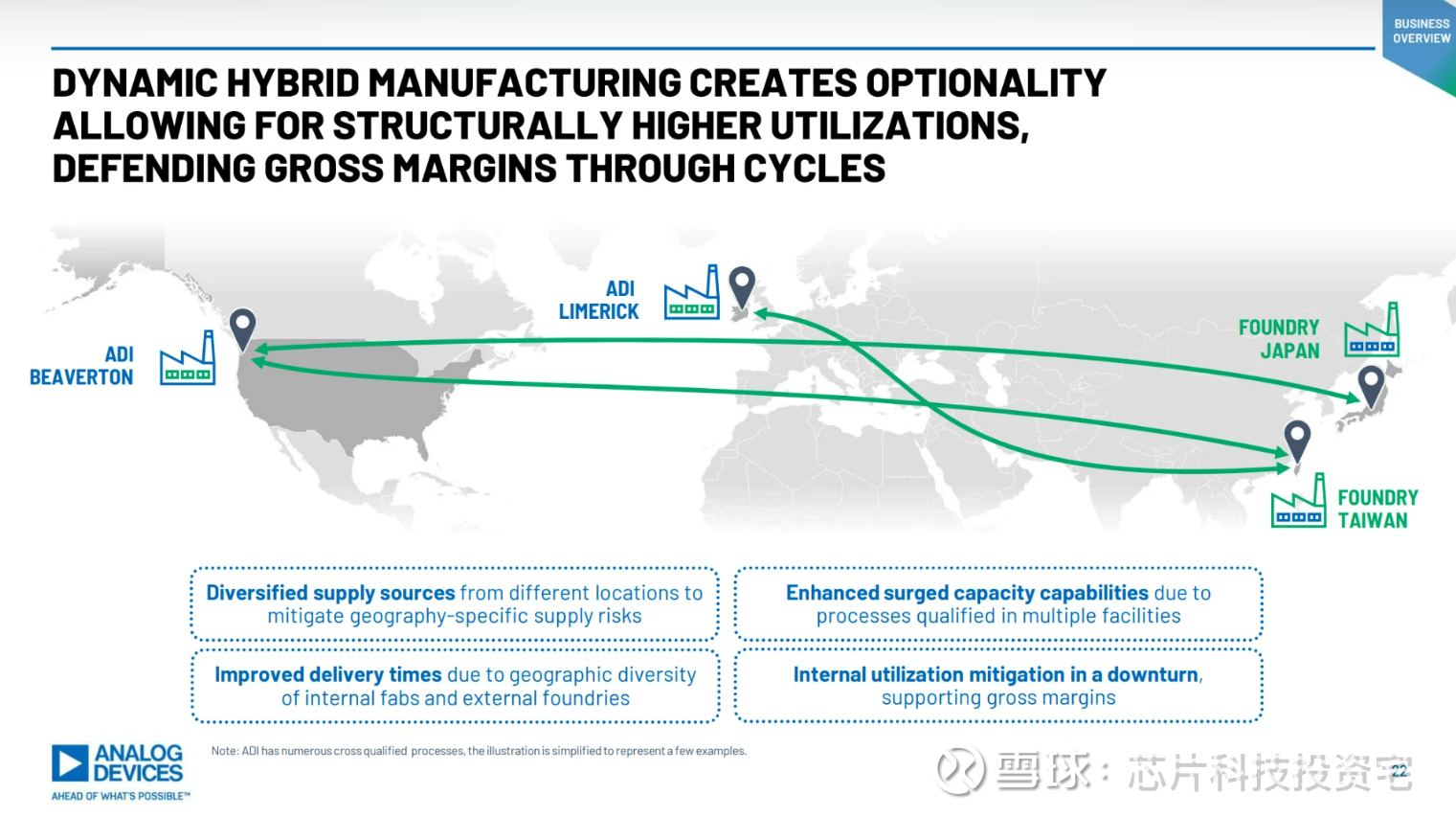 像其他几十年来存在的半导体企业一样,ADI 一直在重塑其业务结构,以应对经济中这些高速增长的长期主题。与此同时,ADI 也在调整内部制造,采用“混合”模式——同时利用第三方晶圆厂和芯片封装合作伙伴——以最大化股东的盈利能力。