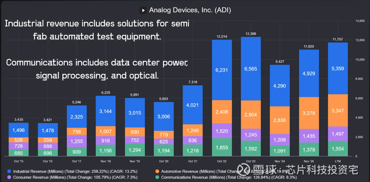 鉴于收入不断攀升至新高点,以及 ADI 管理层对 2026 年是丰收年份的评论,你可能会认为所有这些增长都与人工智能数据中心有关。但事实并非如此。这一现象也具有有趣的启示意义。截至 2026 年 1 月的最后 12 个月报告期间,“通信”收入(包括数据中心以及互联网和无线网络客户)仅占收入的 13%。