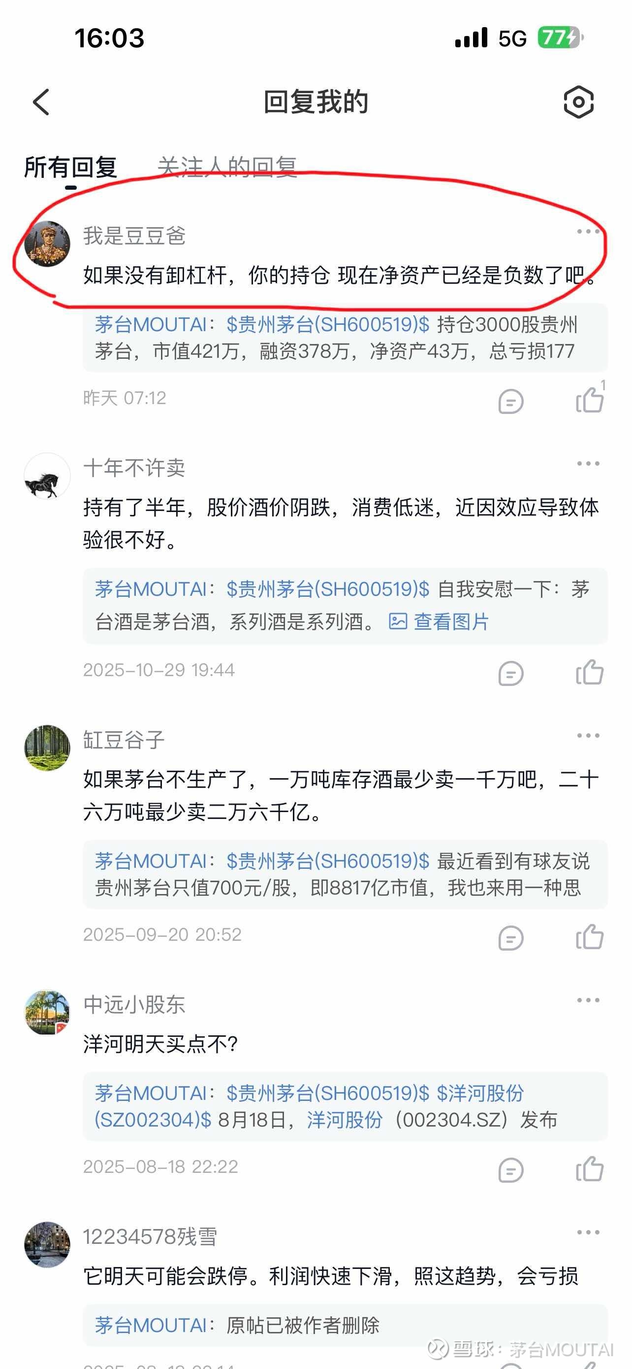 $贵州茅台(SH600519)$ 持仓3000股贵州茅台,市值401.1万,融资379万,净资产22.1万,总亏损197.9万,综合融资成本4.3%,融资年利息16.25万,年分红15.44万,综合持仓成本1989元/每股。回应一下球友的关切,净资产还不是负的。现在唯一关心的是,今年分红能不能涨6%达到16.36万且以后每年分红不降低,那样我就能永远持有茅台吃股息了,毕竟洋河已经承诺100%分红了,茅台为什么不可以。茅台现价股息率3.87%,比存银行还是要强一些的。