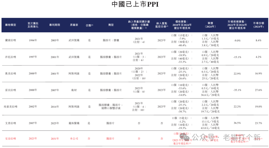 目前中国上市的产品管线非常多,而且前辈们的获批年代较早,专利很多都到期了,广泛使用的雷贝拉唑早已于2007年到期,虽然埃索美拉唑、艾普拉唑已经在不断蚕食其份额,保持高增长,但就算是艾普拉唑其专利也到头了,PPI整体市场以仿制药主导的。