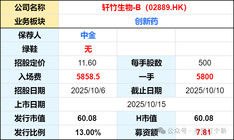 轩竹这家的创新药就没那么“创新”了,三核心产品竞争者颇多,算是个四环概念股,机制B+10%+创新药的涨幅还是很可观,但四环本体的总市值或成大压力位,入通压力算较大的,公配1.35w手仍是抽签。老猫评级给个2-4星!