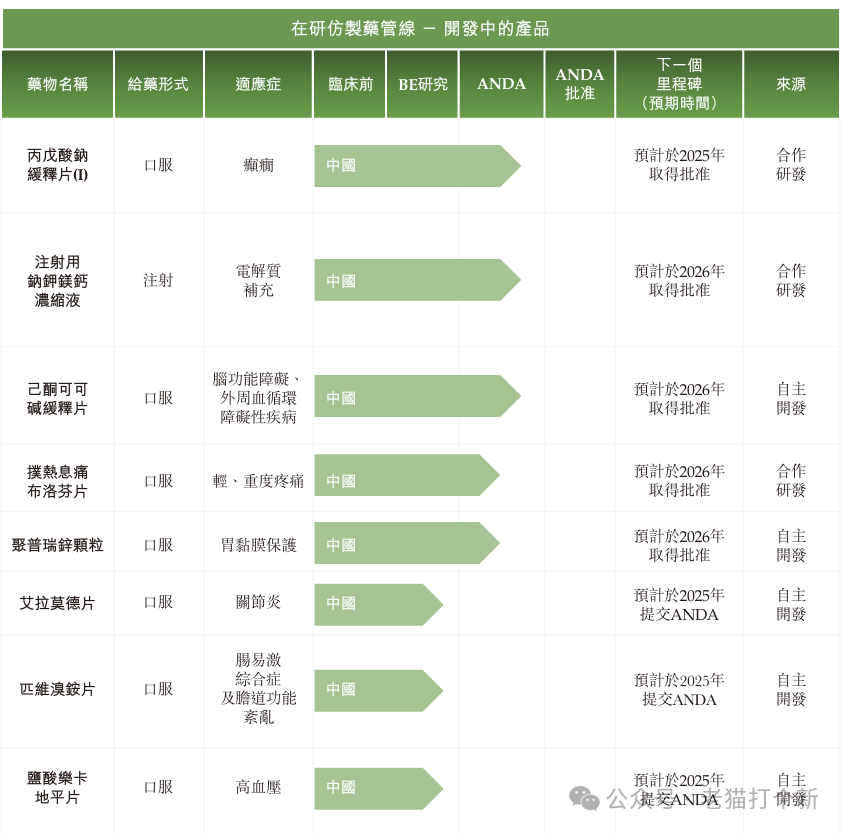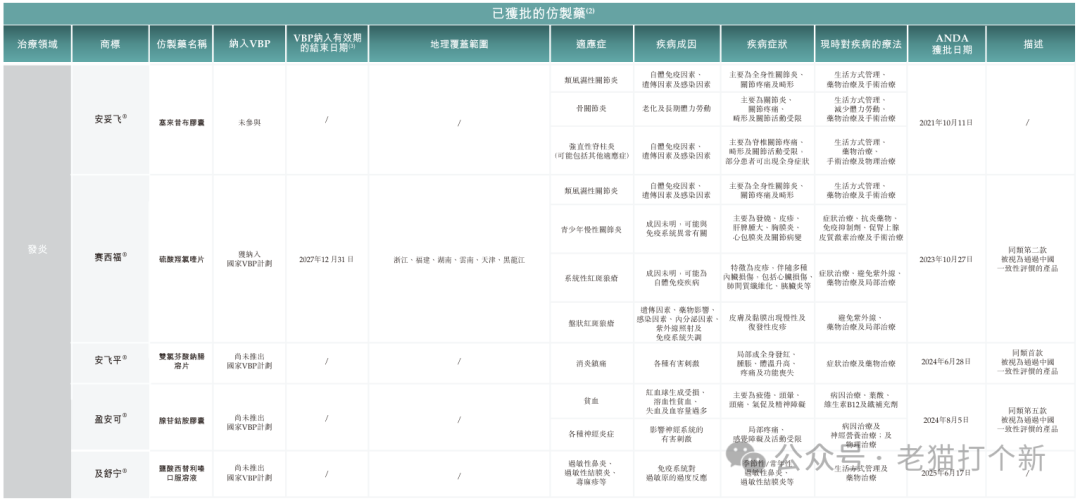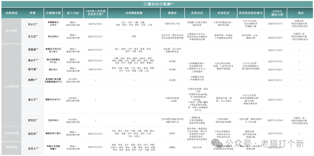 截至最后实际可行日期,公司已就15款仿制药获得国家药监局批准,其中有4款入选国家带量采购VBP计划(包括安必力®、海慧通®、瑞安妥®、賽西福®),4款入选省级带量采购VBP计划(包括安优凡®、安立定®、海必平®、海可喜®),并建立拥有4款在研创新药的管线,目前公司的收益来自13种获批准产品。