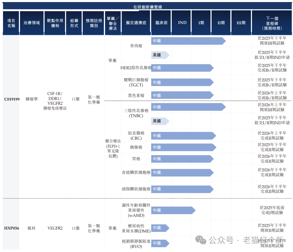 而联合疗法上,公司正在开发C019199与抗PD-1单克隆抗体等药物治疗多种肿瘤疾病,是不是很眼熟,三生制药$三生制药(01530)$ 与辉瑞签的SSGJ-707就是PD-1/VEGF双抗药,而公司的C019199就有VEGFR2靶点(负责将VEGF的指令转化为细胞内行动),虽然公司是联合治疗,但方向上至少与大热的出海赛道匹配了。