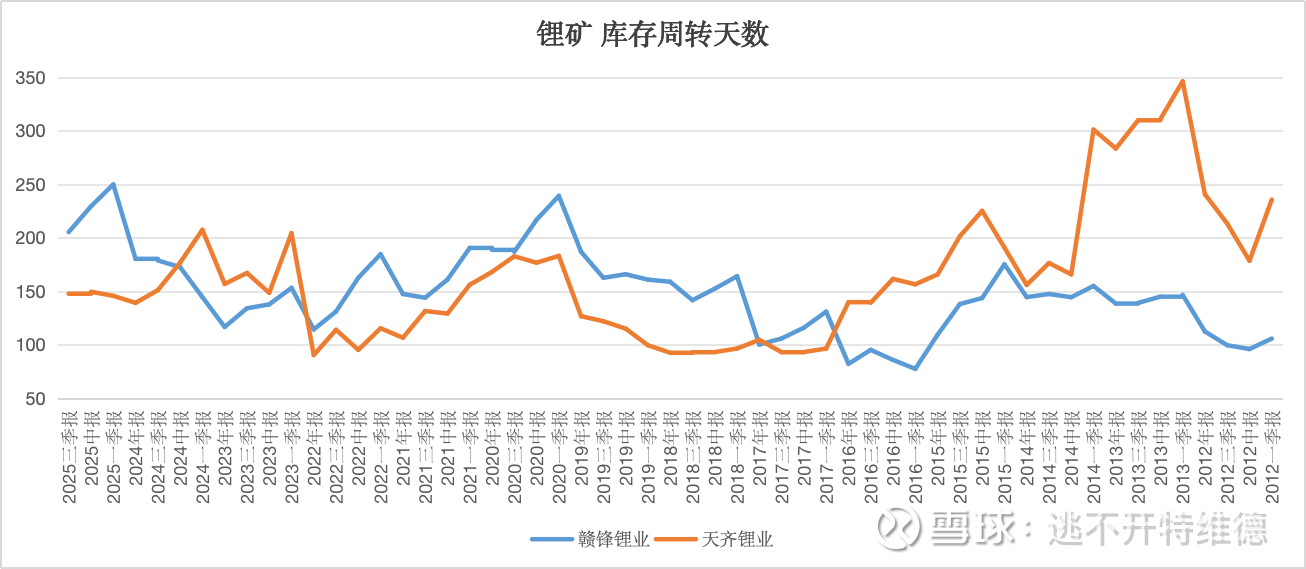 看图1(赣锋/天齐),呈现出非常规律的波动。从 2020 年的低点,到 2021-2022 年的高潮,再到 2023-2024 年的累库,最后在 2025 年一季度见顶(赣锋库存周转天数达到约 250 天的峰值)。这是一个极其标准的“4年基钦周期”。