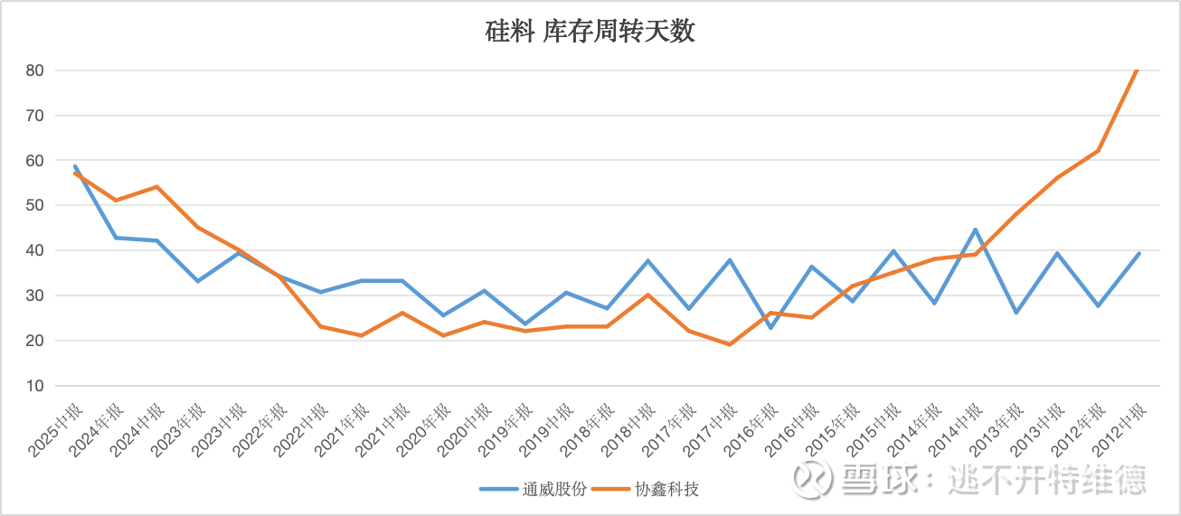 从图2中可以清晰看到,通威和协鑫的库存周转天数在 2022 年触底(约 20-30 天)后,整体重心一直在抬升。