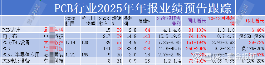$鼎泰高科(SZ301377)$ ,是生产PCB钻针的,25Q3 收入15亿,净利润2.8 亿,增速分别为29%、64%。全年净利润预告 4.1-4.6 亿,同比增长81%-103%。第四季度净利润1.3-1.8亿,环比增长 6-46%。全年净利润高增长的原因公司解释说是服务器、数据中心等需求爆发,带动高端PCB市场需求提升,公司精密刀具及抛光材料产品需求增长;同时持续优化产品结构,提升盈利水平,推动业绩高速增长。。