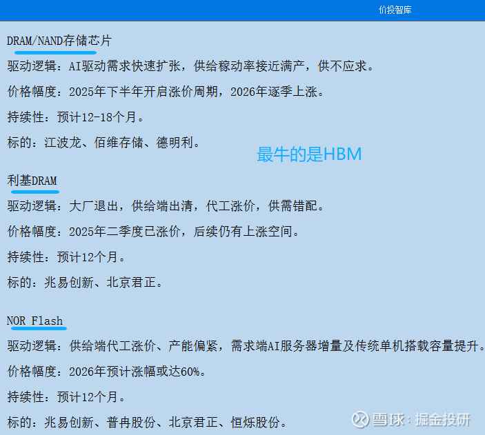 第一,通用DRAM和NAND,也就是咱们U盘、SSD里的颗粒。为什么涨价?AI服务器消耗太大,晶圆厂满产也供不上。高盛预测,2026年每季度价格都在涨,至少持续12到18个月。直接受益的就是模组厂商:江波龙、佰维存储、德明利。