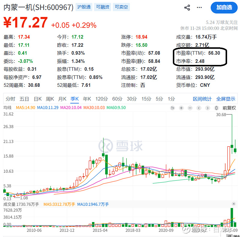 现在的市净率是2.5倍,市盈率56倍,估值太高了!