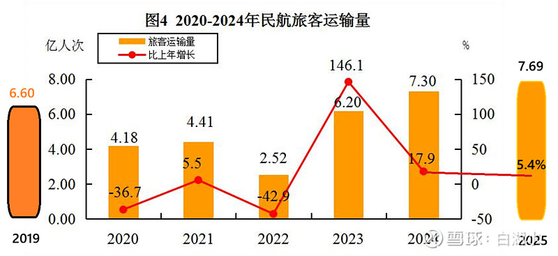 下图是中国最近七年的民航客运量。2019年是一个顶点6.6亿人次,经过新冠疫情后直到2024年才超过这个顶点。2025年的数据只有前十一个月的,同比增长率是5.4%,推断全年客运量是7.69亿人次创历史新高。