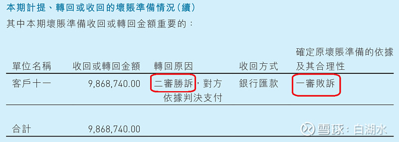 最后看一个坏账转回的案例,经过打官司从客户十一收回了一千万元的坏账。在一审败诉的情况下,二审胜诉了,对方通过银行汇款的方式支付了长期拖欠并且计提坏账的一千万元。