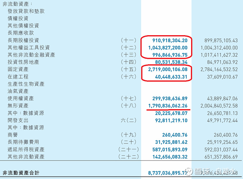 非流动资产如下,最主要的是划红线的几个项目。股权投资包括三个科目:长期股权投资、其它权益工具投资、其它非流动金融资产,合计30亿,占非流动资产的1/3。固定资产和在建工程合计27亿,也大约占非流动资产的1/3。最后是无形资产18亿,其中土地使用权和软件占大头,信息网络公司的软件肯定占比大。