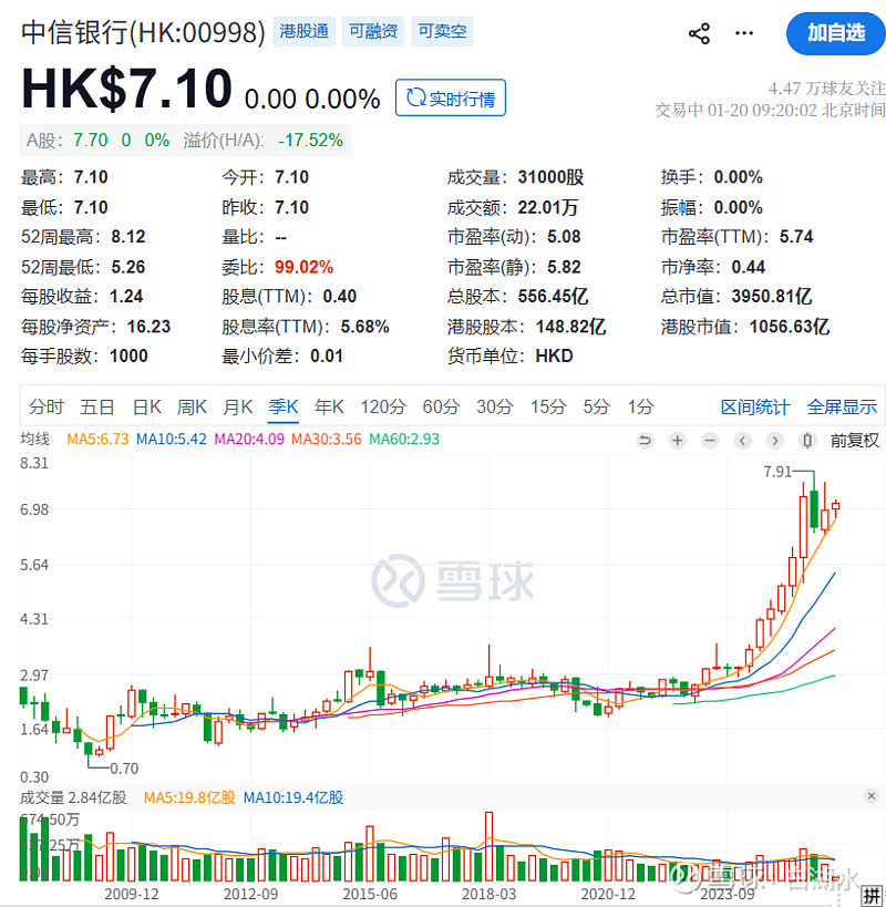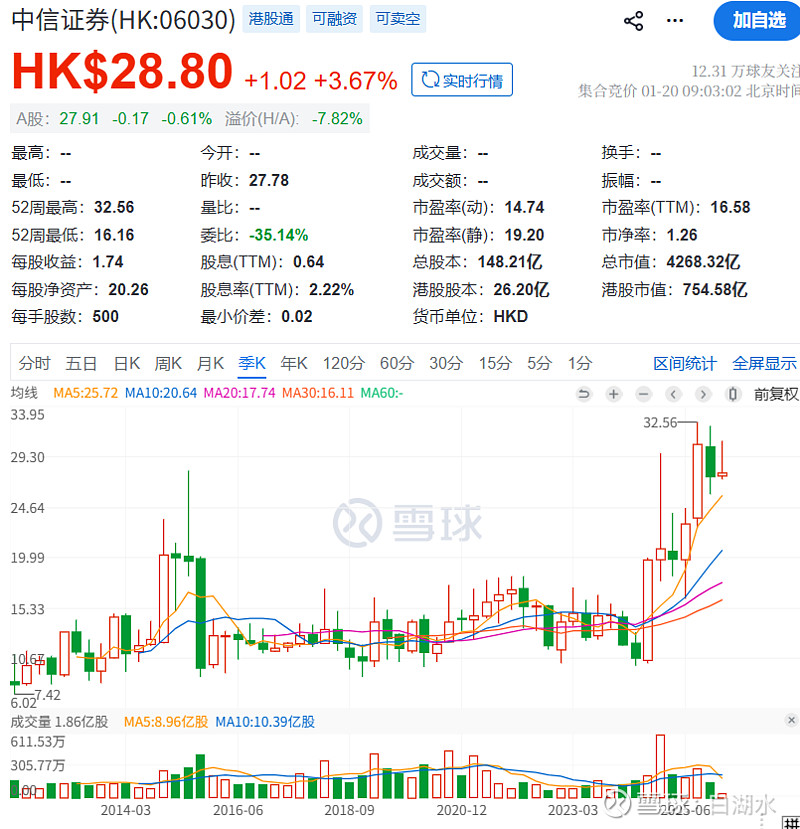 大家总觉得这轮牛市券商股没有发力,其实涨得并不少。2024年918前的最低价格大约10港币,现在约30,涨了200%,远超大盘涨幅。中信证券的估值明显高于其它券商股,在于它的龙头地位,已经形成了共识所以股价下不来。
