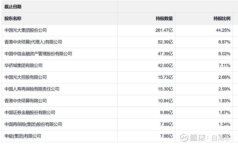 十大股东如下:光大集团合计占股47%,港股占比9%,中信金融资产就是以前的中国华融占比8%,华侨城集团占比7%。