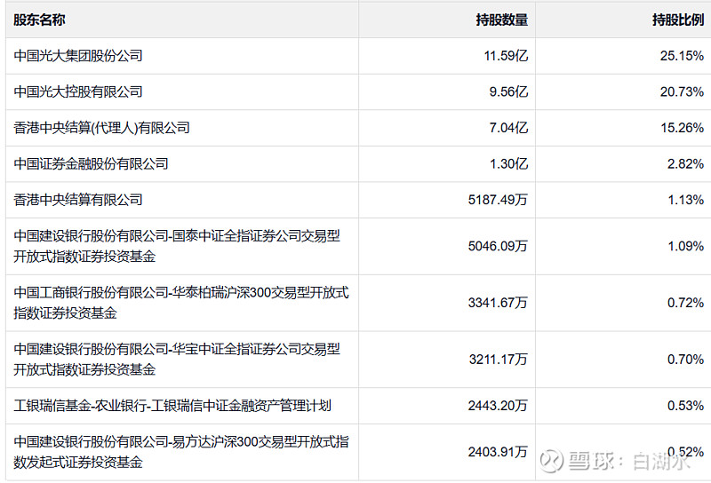 十大股东如下,光大集团合计持股46%,港股占比15%。