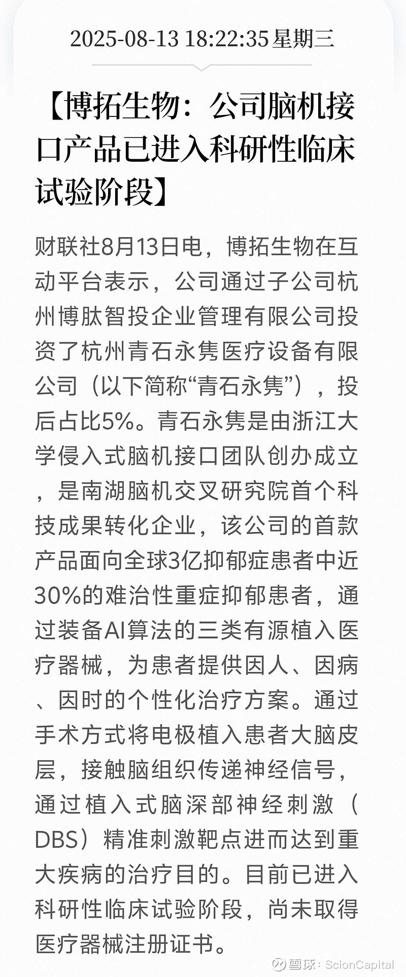 $博拓生物(SH688767)$ 别的先不说,从这家被投公司的业务方向来看,侵入式,三类有源植入,DBS,科研临床。看到这些关键词就可以基本判断这个公司方向是对的,也是在做实事的。好过绝大多数被吹得天花乱坠的所谓脑机概念股。