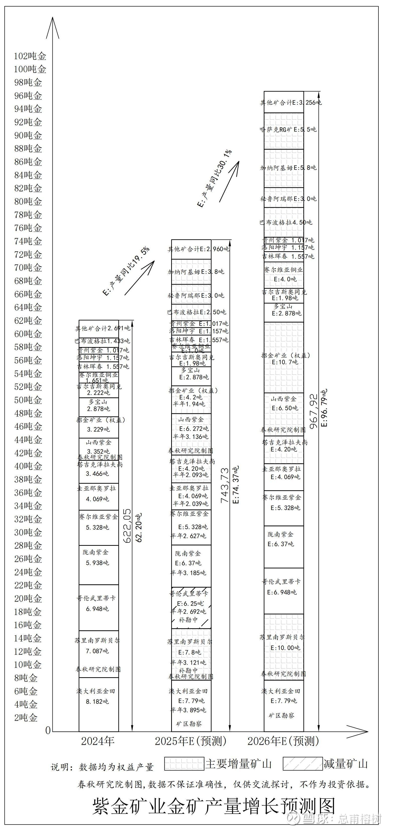 今天将紫金矿业这两年黄金矿山的年产量增长预测图分享出来: