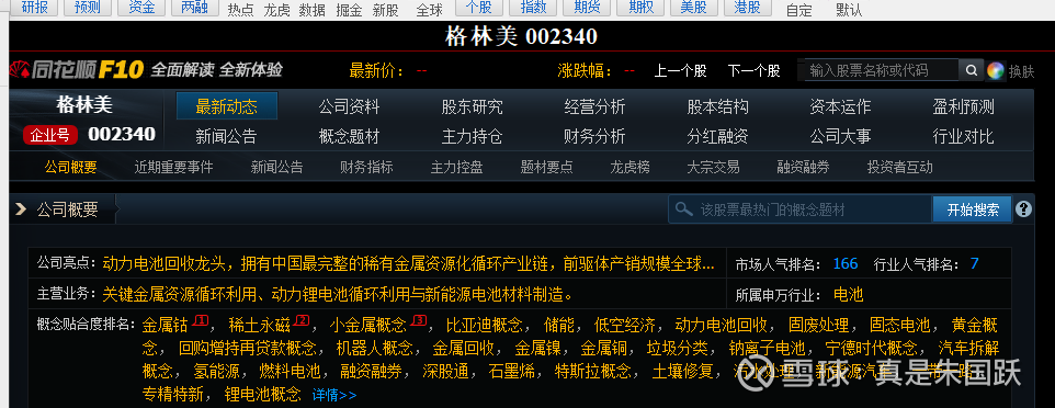 三、题材;打开格林美F10,目前其所涉的题材排名前三的是金属钴,稀土永磁和小金属概念。随后三十来个概念如储能,固态电池,氢能源都是当今的热门题材,前期爆炒的机器人,低空经济也赫然在列,光金属概念除钴外还有金、镍、铜。特斯拉、比亚迪和宁德时代概念并存,一句话,综观这二年的风口题材,还少有格林美沾不上边的,妥妥的一个“铲子”行业。难能可贵的是格林美不仅有题材,还有实实在在的产品,而且多项产品的指标都位居全国乃至世界头部(前三),一不留心来个爆款产品,想不发都难。就如金属钴本是格林美镍矿的伴生品,甚至连成本都可以忽略不计(在产镍中消化),但忽然天降馅饼,金属钴一下窜升至首位,也是的,2万吨钴的利润也许可以吊打格林美其他所有产品和经营利润,这个C位当之无愧,所谓的“东方不亮西方亮”,未来格林美从事的这么多领域再出几个“姑奶奶”(如和孙学良院士在固态电池研发上就取得了突破,极具王者之相),给股东以惊喜完全值得期待。
