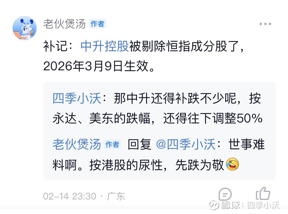 美东汽车从2021年开始不断跳崖式的下跌给鄙人最大的感悟就是如果用价值投资理论一个企业到底值多少钱,在港股市场面前根本不值一提,如果作为投资逻辑非得破产!仍然维持2月14号对中升汽车被踢出恒生指数的股价预测,2026年2月14号中升汽车的股价是12.19港元。$中升控股(00881)$ $美东汽车(01268)$ $赛力斯(09927)$