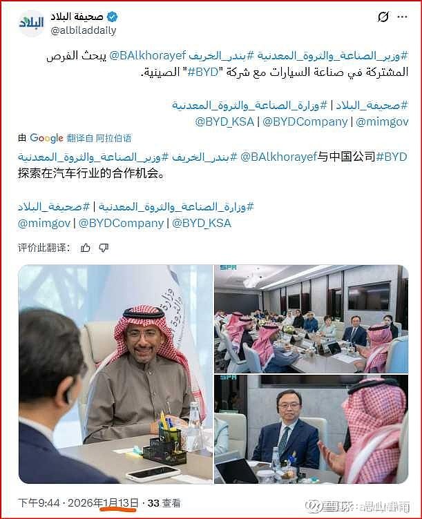(转)沙特阿拉伯工业和矿产资源大臣班达尔·阿尔-霍拉耶夫与中国比亚迪公司董事长王传福探讨了汽车产业本地化的机会。