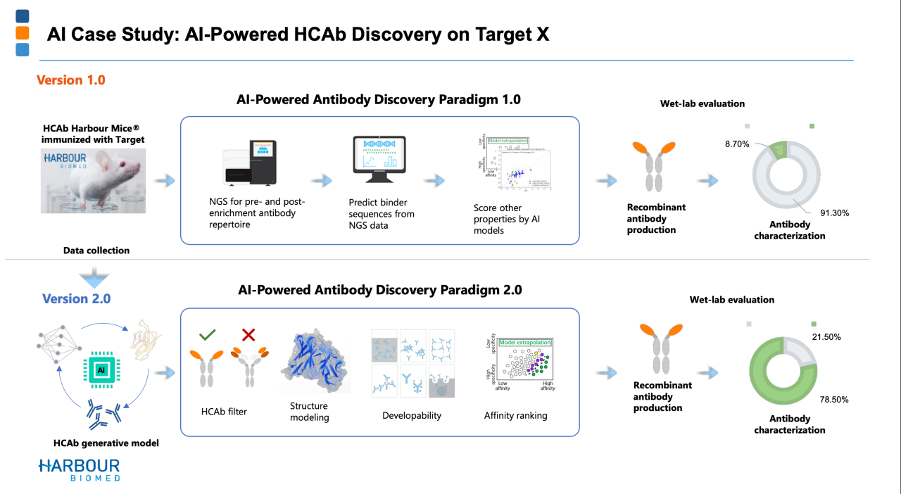 这一迭代,带来了可观的能力提升。抗体表征的阳性率,从8.7%提升到78.5%。所谓的抗体表征阳性率,指的是“一批抗体里,真正符合我们设定标准(结合、功能、开发性)的那一份占比”,越高说明筛选越高效、平台越强大。从8.7%提升到78.5%,是现象级的提升。
