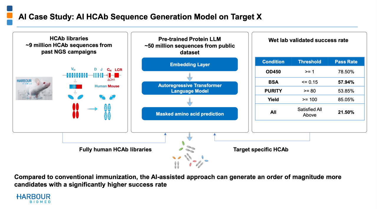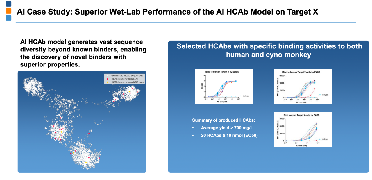 不仅效率大幅增加,并且成功率指数级提升。根据和铂医药所说,结合900万条内部序列+5000万条来自公共的数据库序列,构建了自主大语言模型,真实结构的序列,展现了很高的成功率。有高达21.5%的分子属于高质量的序列,也就是同时满足白蛋白结合低、纯度高、表达量高的比例,综合来看效率和成功率是显著提升的。