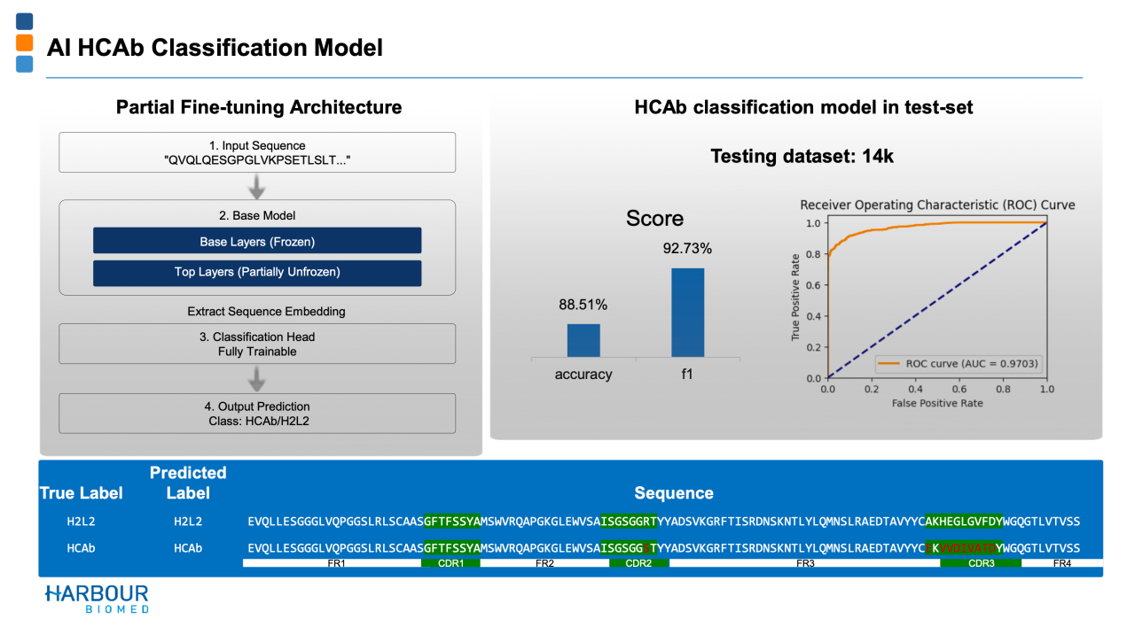 另外,和铂医药的AI HCAb分类模型也非常值得关注。这属于重要的筛选模块,支持后续的功能预测,1.4万条序列数据集的测试中,准确率超过90%,表明AI HCAb模型可以对生成的抗体序列进行精确的分类,极大提升后续开发的成功率。