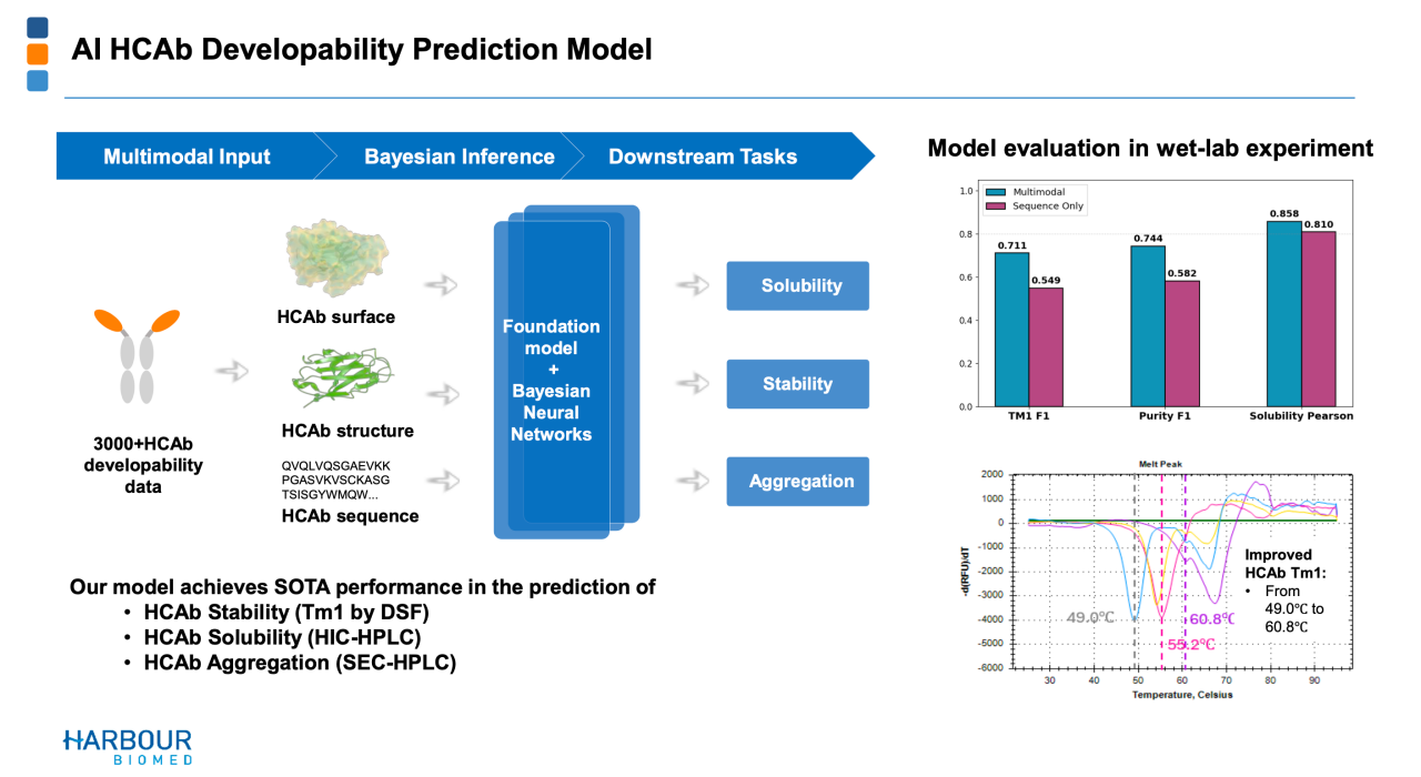 和铂自主的AI大模型在成药性方面也能提升。逻辑是,大量的可开发行数据,为模型提供可量化的基础,最终构建的可开发预测模型,可精准预测热稳定性、溶解性、聚集性,大幅降低后续开发的失败风险。例如,在热稳定性方面,AI HCAb模型生成的抗体Tm1从49.0℃提高到60.8℃,真正意义上提高抗体药物分子的成药性。