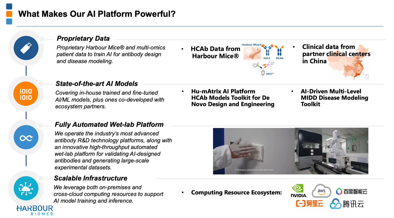 第一,专有的数据。公司基于抗体平台,多年研发的know how积累的数据,以及临床合作积累的多组学数据,这是根本。对于AI来说,最关键的是算法和数据,每家AI企业的数据来源不同,能力差异会很大。和铂的优势就是全球稀缺的平台,所积累的海量的独家数据,这是其AI布局可以非常顺利的关键。
